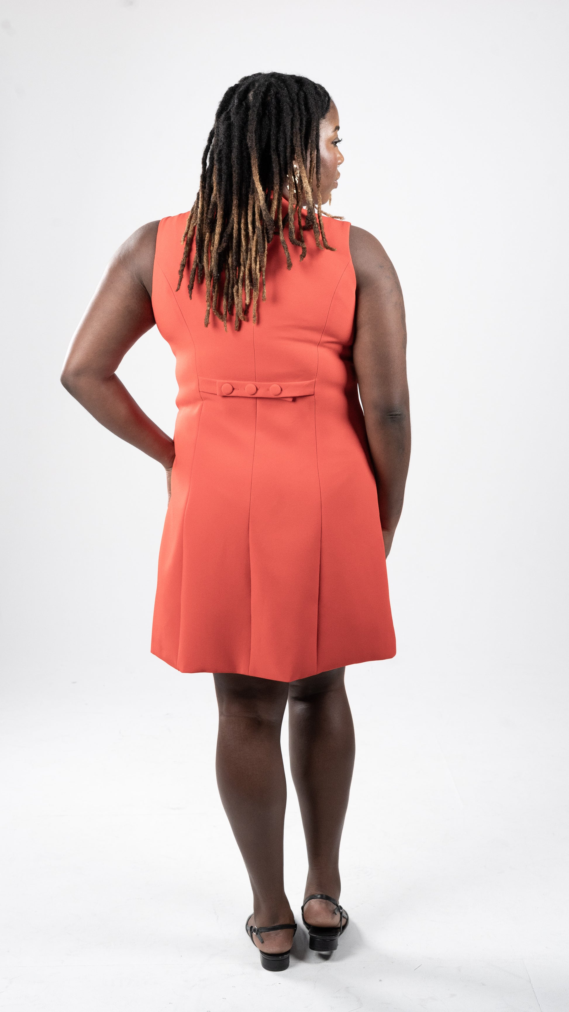Command attention in the Power Move Dress, a striking sleeveless piece that blends bold structure with timeless sophistication. Designed in a vivid red hue, this tailored mini dress features a high neckline, sculpted silhouette, and a row of fabric-covered buttons that run down the front for a clean, its giving elevated corporate.